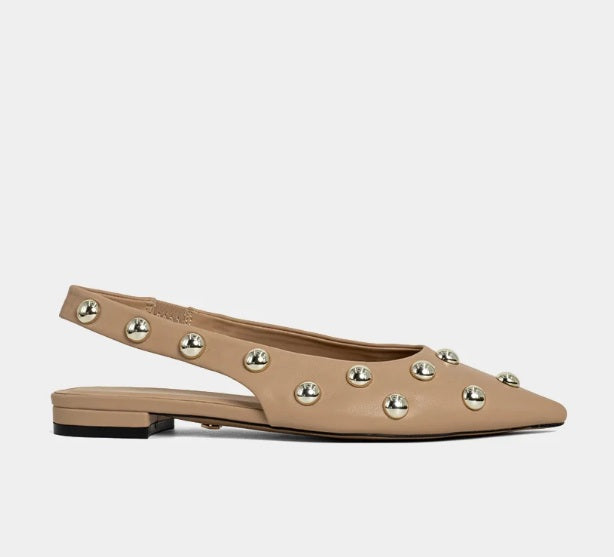 Sharp, sleek, and studded with attitude. ARIZONA in Nude blends feminine lines with a fierce edge, thanks to its pointed toe and bold metallic embellishments. This slingback flat elevates any look, whether you're keeping it casual or making a quiet statement at the office. A versatile neutral you’ll wear on repeat.