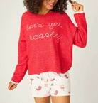 Snuggle-worthy in festive red, this sweater knit top is stamped with a bold “let’s get toasty” graphic across the chest. Designed with a crew neckline, ribbed trim, and ivory cuff accents, it’s a playful layer for pairing with plaid pants, joggers, or denim.