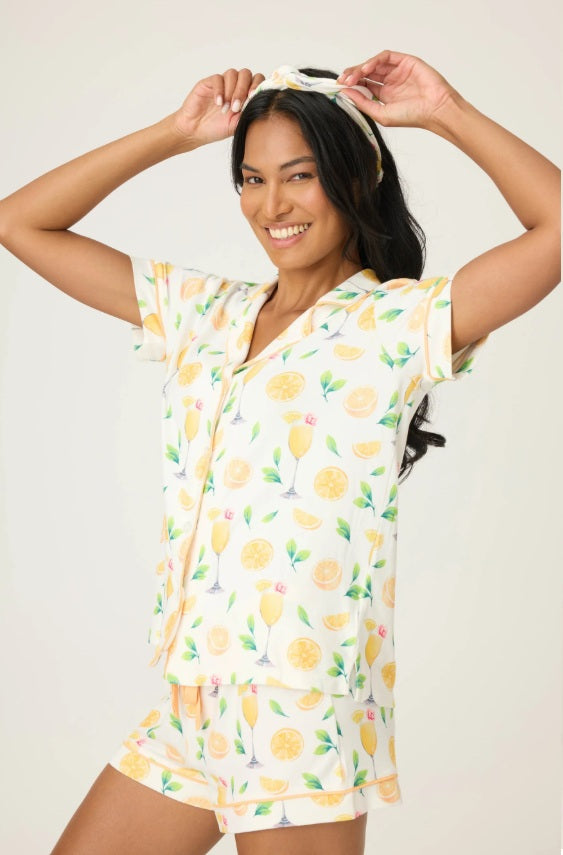 Cheers to sleeping in and bottomless at-home brunch. This three-piece PJ set is made from buttery-soft jersey that’s cool to the touch and stretchy in all the right ways. The allover mimosa print brings the vibe—bubbly flutes, juicy citrus, and sprigs of green. Comes with a short-sleeve button-down top, drawstring shorts, and a matching headband.