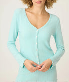 Fitted and sweet with a vintage feel, this light mint cardigan is crafted from double-brushed pointelle fabric with subtle ribbed texture. It features a delicate V neckline, scalloped trim along the edges, and dainty lettuce-edge sleeves—a dreamy sleepwear essential for layering or lounging solo, all year long.