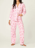 Sweeten your holiday season in this cotton flannel pajama set, scattered with candy canes tied up in pink bows. The three-piece design includes a button-down top with contrast piping, relaxed drawstring pants, and a matching headband—made for movie marathons, peppermint cocoa, and cozy mornings that stretch into afternoons.