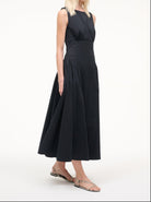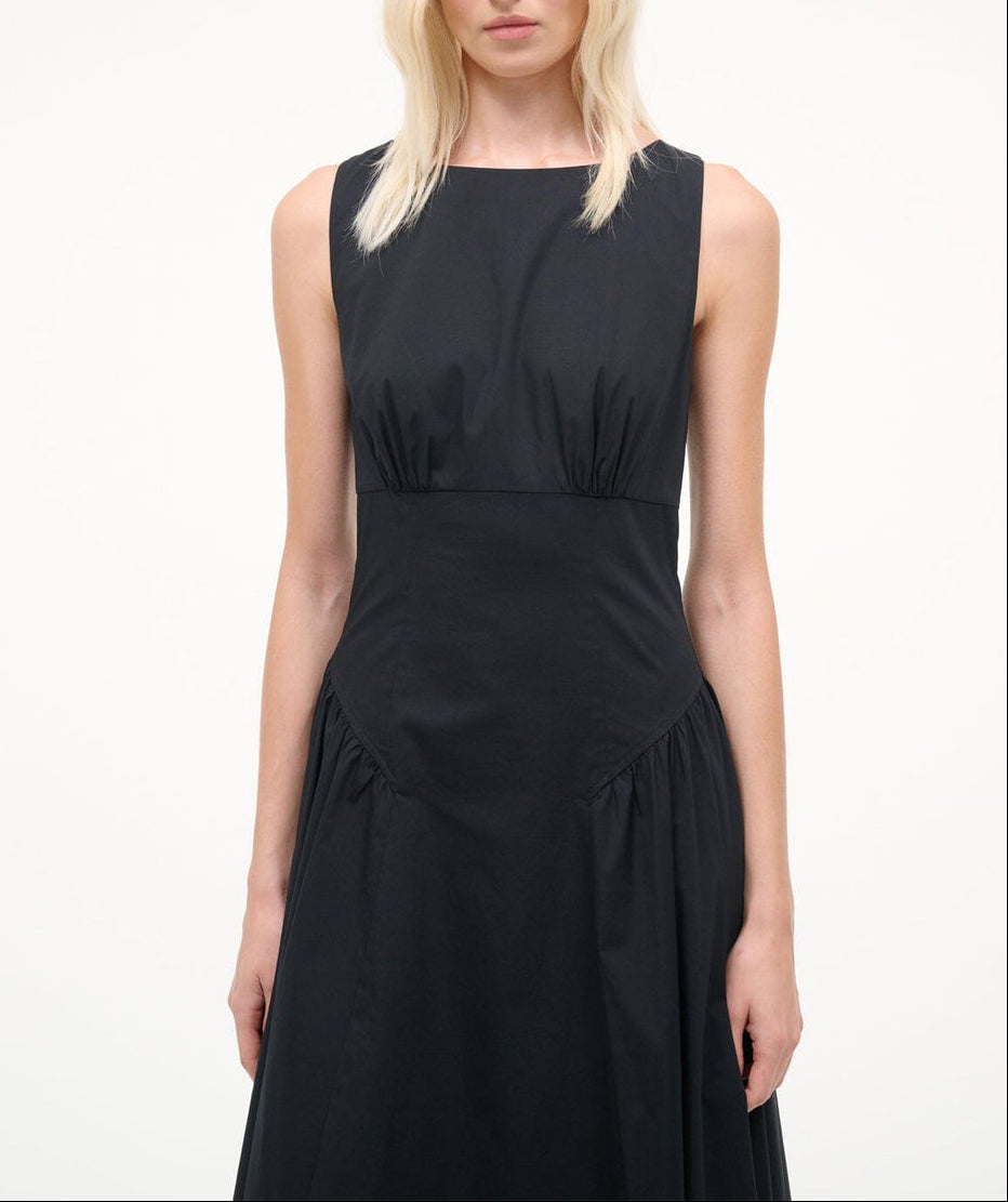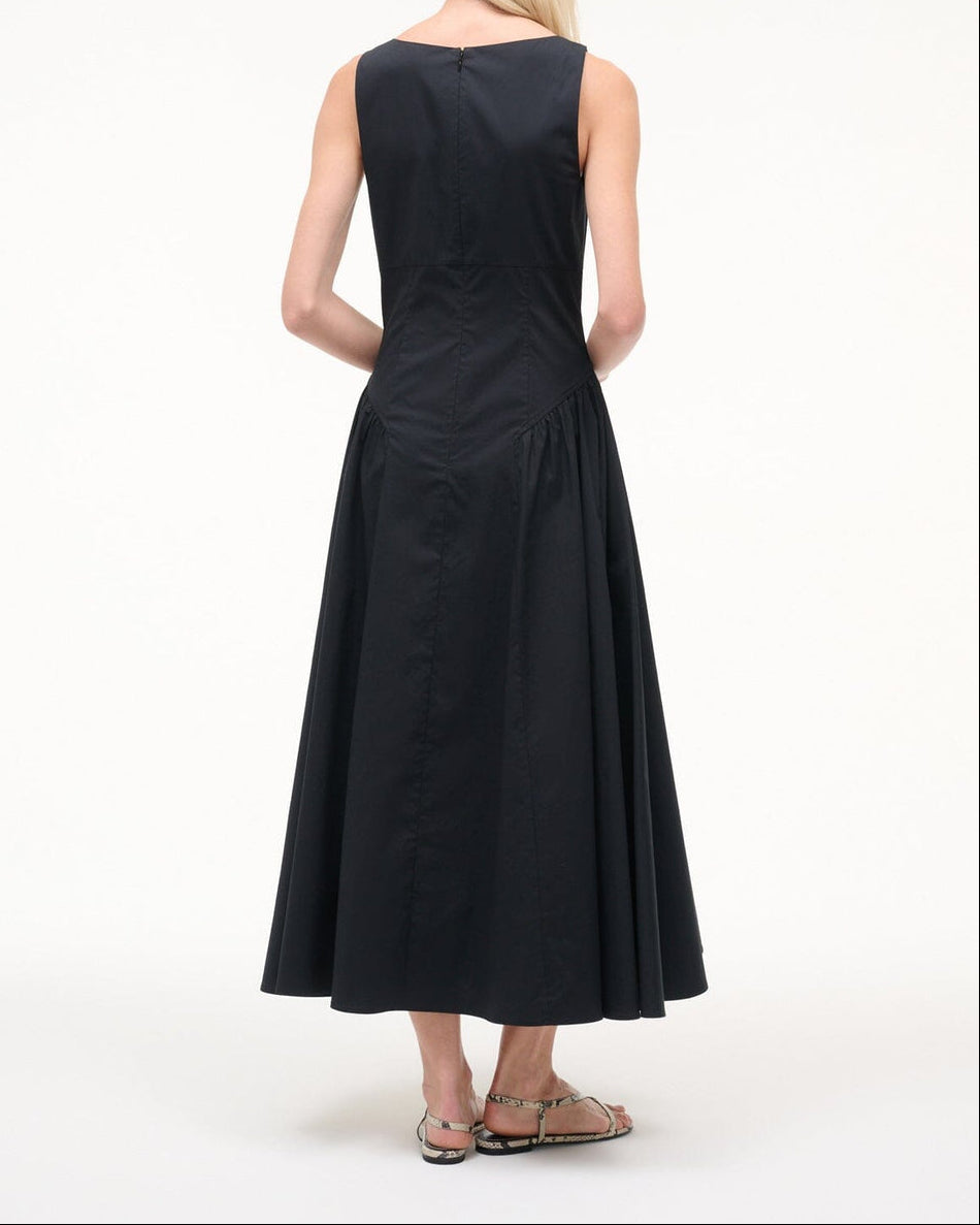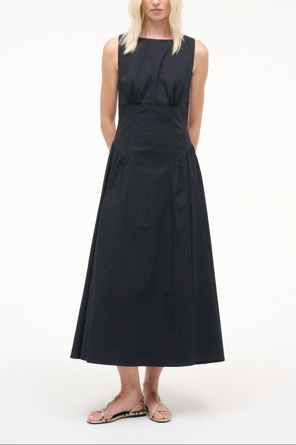 Effortless elegance in crisp poplin. This A-line dress features a high neckline, drop waist with structured pleats, and stretch fabric for all-day comfort.