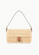 The Harlow Bag in raffia features our signature Moon buckle hardware, a snap closure and an interior pocket.