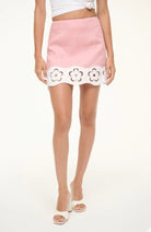A linen mini skirt with a contrast floral cut out border at the hem. The Margaux Linen Skirt can be worn as a set with the matching Linen Top.
