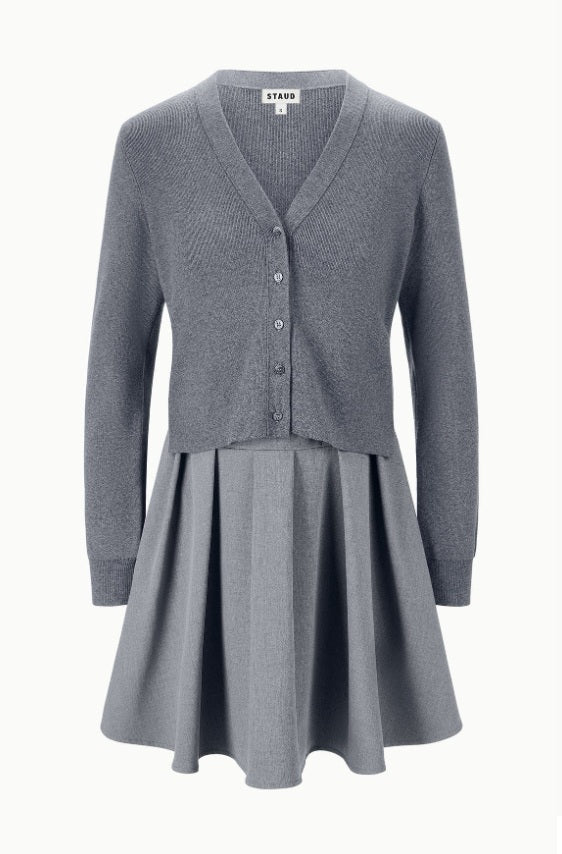 The Milo Dress is a mixed media mini dress, with a woven tonal skirt and a full-fashioned long sleeve cardigan in our cotton cashmere.