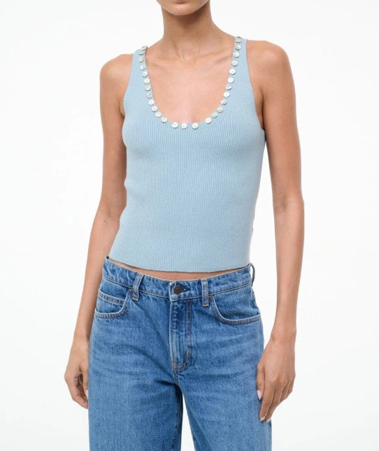 The Neva Tank is a merino wool and cotton blend tank with decorative button detailing along the neckline.