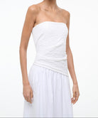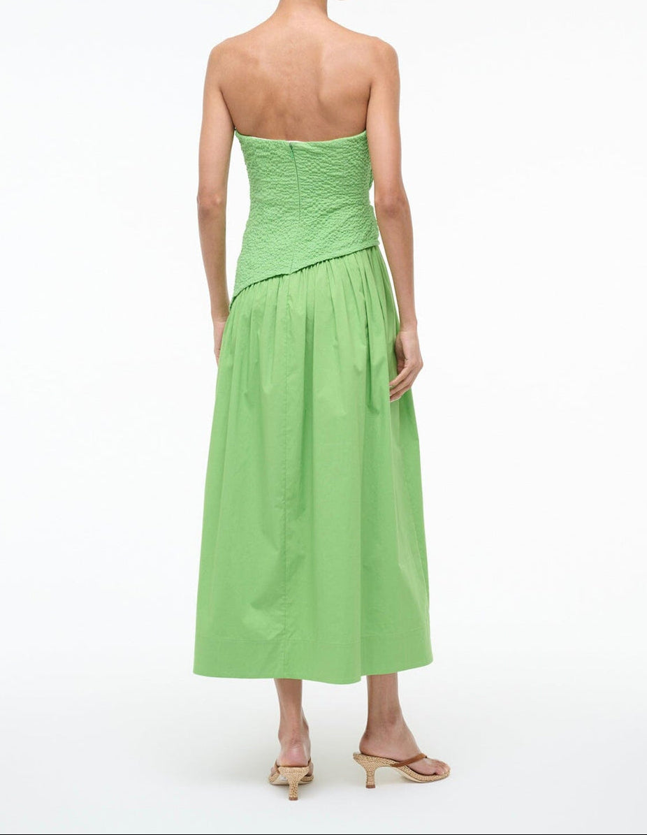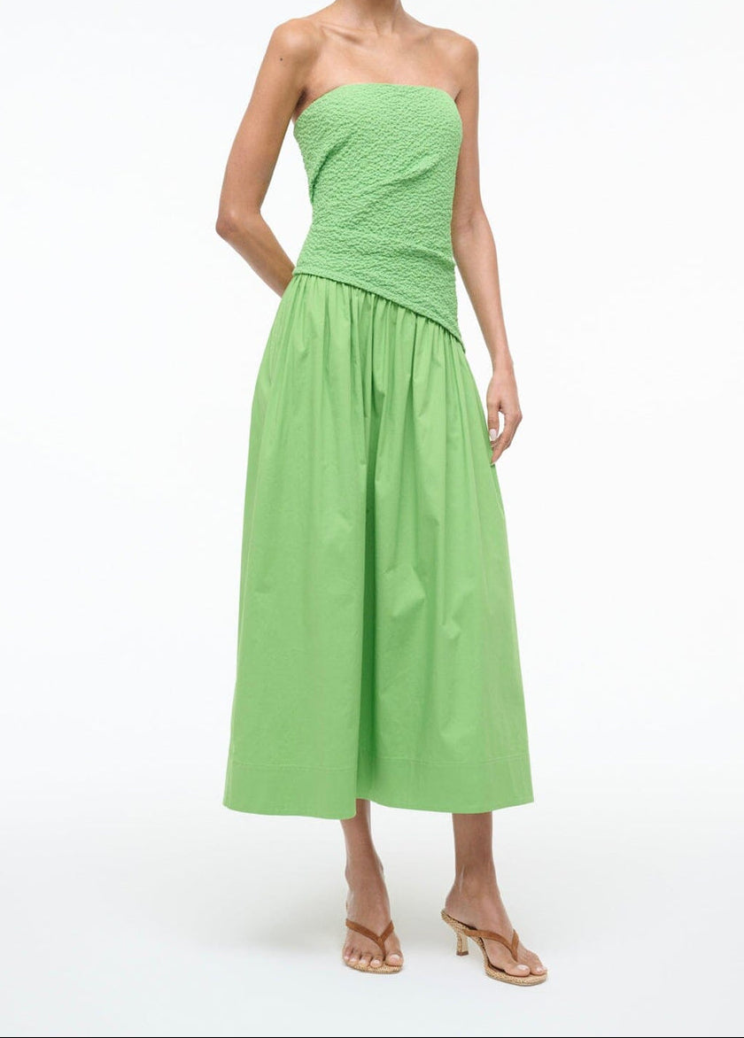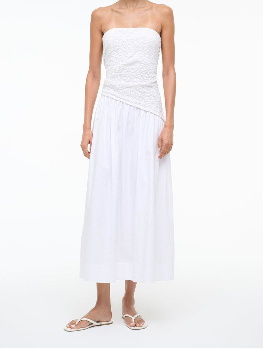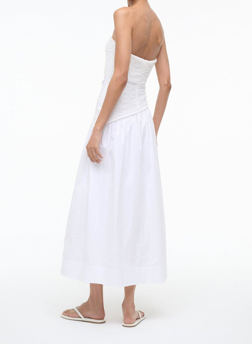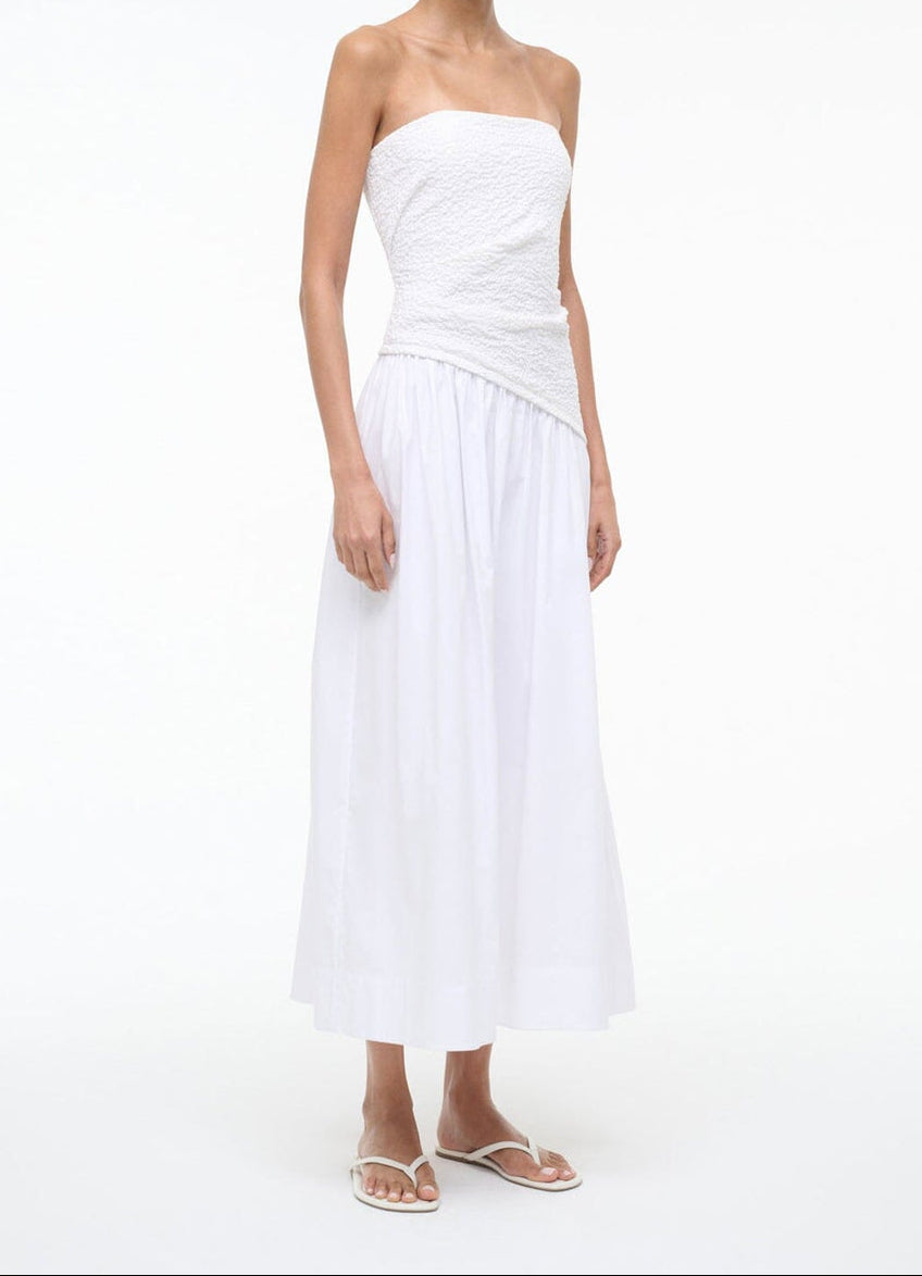 The Nia Dress pairs a smocked cotton bodice with a structured poplin skirt. Strapless at a midi length, this dress features timeless silhouette that works for any occasion.