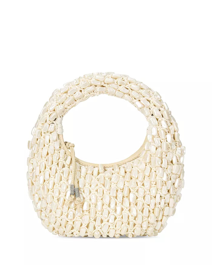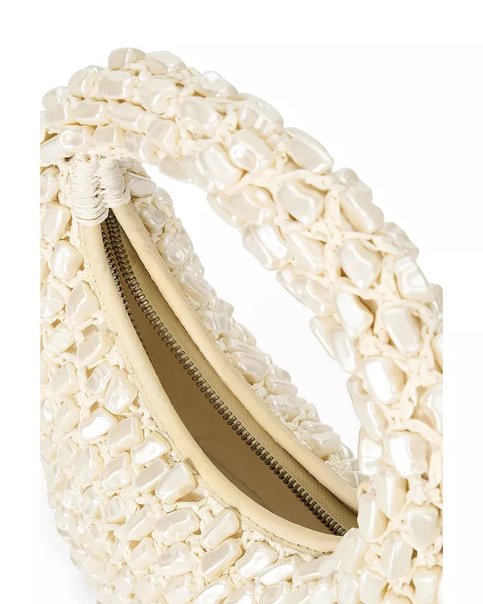 The STAUD Reef Bag is a hand held novelty bag crocheted with pearlescent beads reminiscent of sea shells. This style features a curved top handle with a zipper closure.