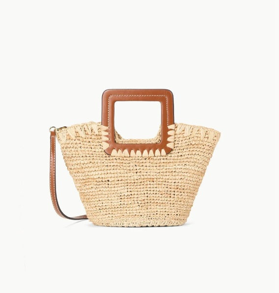 The Mini Shirley Bucket features an all-raffia design with square leather handle and magnetic closure.