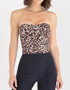 With its cropped silhouette and structured design, this leopard-print vegan satin bustier brings an alluring edge to any outfit. Bold yet refined, it offers a fresh approach to after-dark dressing, perfect with high-waisted denim or sleek vegan leather.