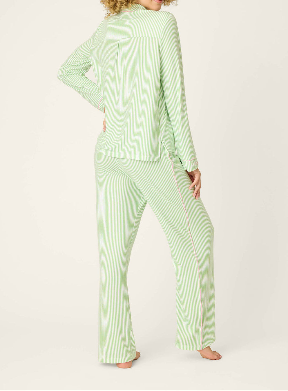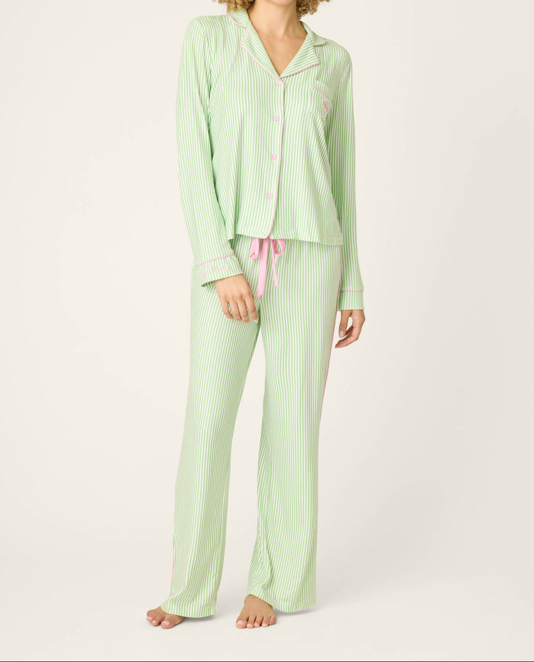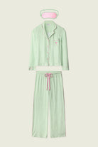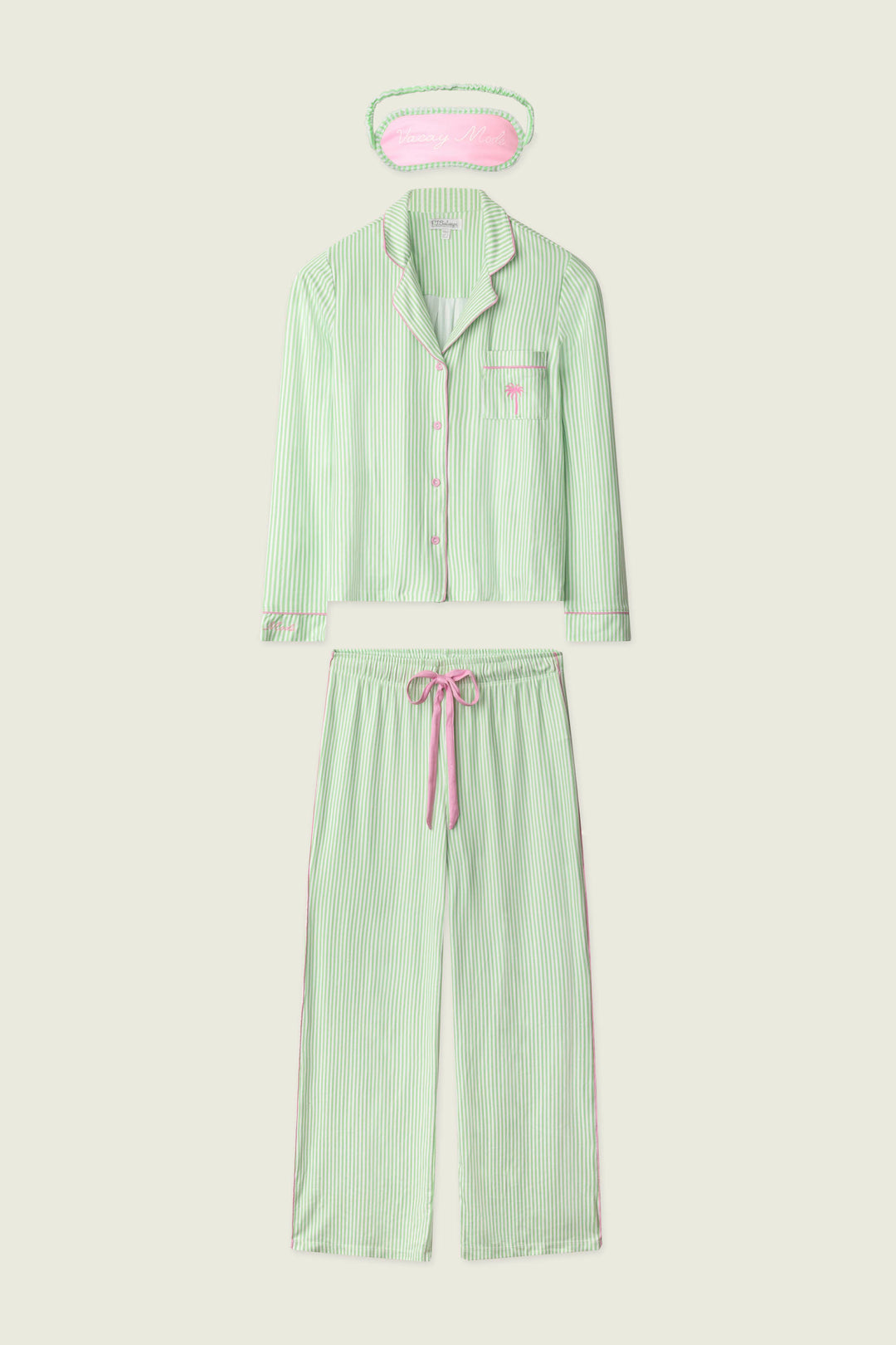 This green‑and‑white striped three‑piece pajama set is fresh and feel‑good, finished with cheerful embroidered details that add a subtle wink of charm. Crafted in butter‑soft jersey, the button‑front long‑sleeve top and easy drawstring pants are relaxed and comfortable, while both the cuff and the matching sleep mask feature the same playful “Vacay Mode” script embroidery—thoughtful, fun‑loving touches that complete the set with personality.