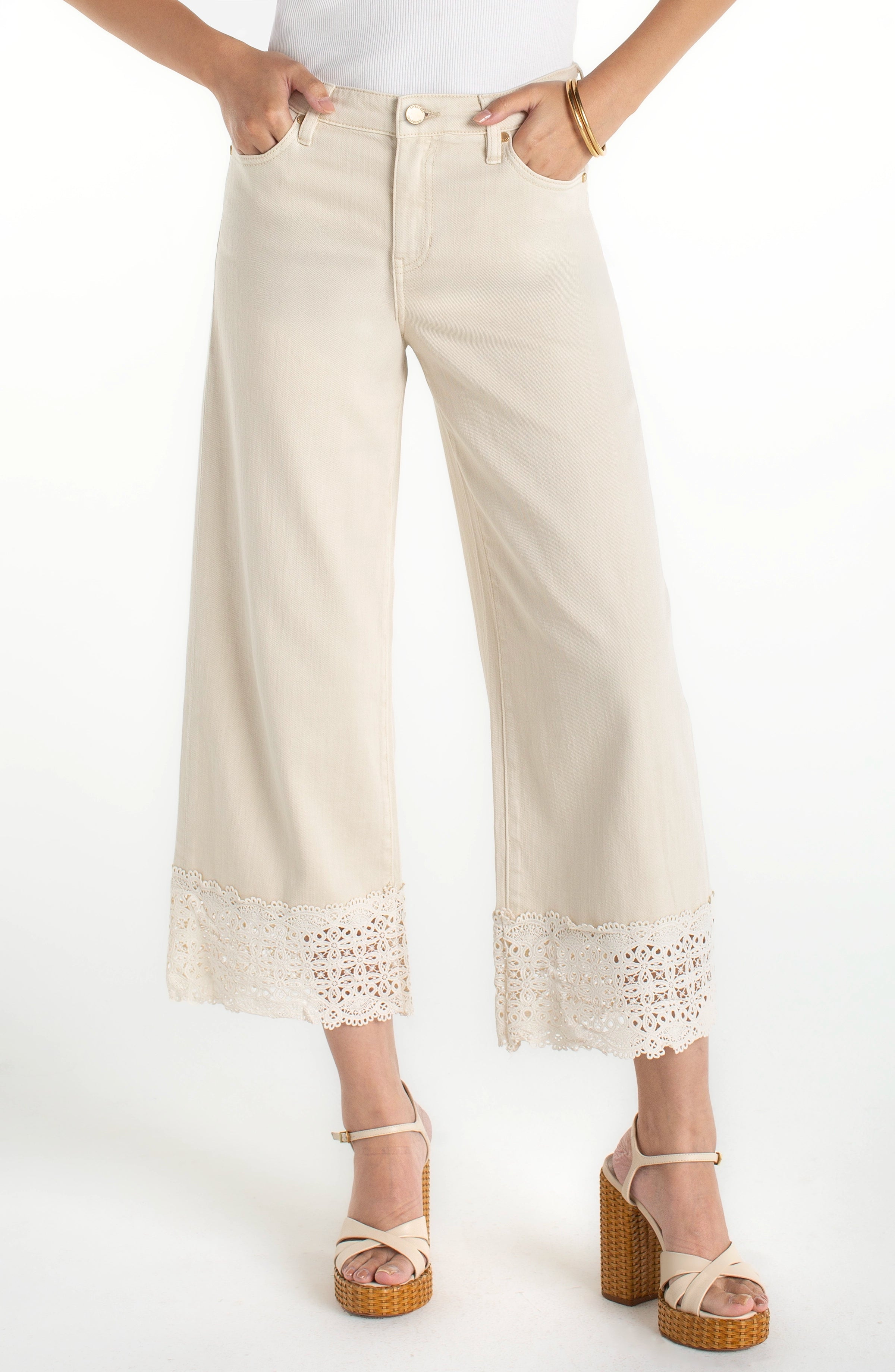 Liverpool Stride Wide Leg Pant With Lace Trim - Ecru