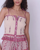The Augusta Top is an easy, sleeveless smocked style with charming design details. Such as adjustable spaghetti straps that tie at the shoulders, a fully smocked bodice, and flirty peplum ruffle. Thoughtfully designed in the Jacqueline Block Print, it pairs with the matching Luelle Skirt for a cute summer set.