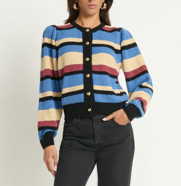 A casual yet chic cardigan that you'll return to year after year. Knit from our plush Pima Velour, the Carmela has a relaxed fit, crew neck, bishop sleeves, and dome gold buttons. This one comes in Velour Multi Stripe.