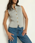 This timeless cotton cashmere sweater vest hits right at the hip and includes details like a mock neck, luxe ribbing, and gold dome buttons. This one comes in Heather Grey.