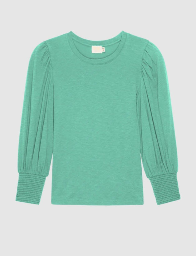 The ease of a comfortable, cotton tee meets the look of a fancy blouse. An exaggerated shoulder, volume in the 3/4 length sleeve, and smocking around the cuff create a delightfully feminine look. It's our best seller for a reason. This one comes in Green Stone.
