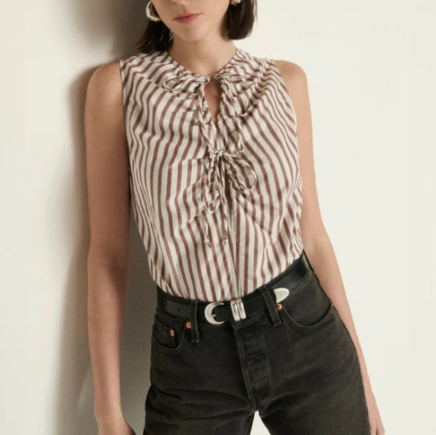 A sleeveless tie-front top that will be your go-to for girl’s night out or brunch the next morning. Crafted from our midweight Paper Touch Cotton Poplin. This one comes in Sable Stripe.