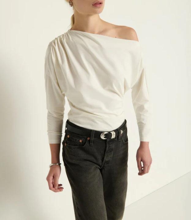 Designed with asymmetric lines and a structured, sculpted fit, this one-shoulder beauty turns the basics on their head. And turns the heads towards you. This one comes in Porcelain.