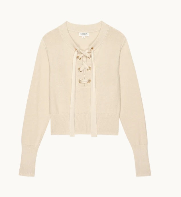 Our lace-up cotton sweater is the epitome of laid-back chic with a ribbed neckband and cuffs, a center front placket, and classic gold grommets. This one comes in Parchment.