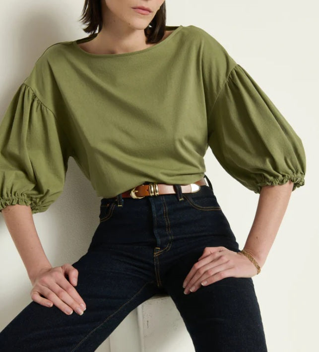 An organic cotton essential with a feminine flair—courtesy of the playful puff sleeves— the the Sandra features a boat neck and drop shoulder. This one comes in Matcha.
